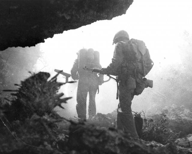 - រូបថតទាហានចូលទៅក្នុងជ្រលងមរណៈ (Death Valley) នៅ Okinawa ក្នុងឆ្នាំ១៩៤៥