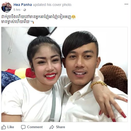 ថ្មីៗនេះដែរមានស្រីម្នាក់ដែលមានរូបសម្រស់ស្រស់ស្អាតសាច់សរទ្រលុកទ្រលន់មិនចាញ់នារីដរទៃប៉ុន្មាននោះទេ នាងក៏បានបង្ហោះរូបមួយសន្លឹក ដែលរូបនោះកំពុងធ្វើឲ្យអ្នកលេងក្នុងបណ្ដាញសអ្គមហ្វេសប៊ុកខឹងសម្បា ដោយរូបជារូបនាងយកជើងធាក់កណ្តាលមុខបុរសម្នាក់ ហើយក៏បានសរសេរថា៖